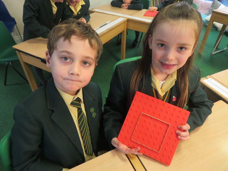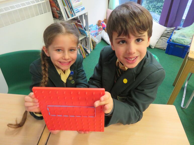 They then worked in pairs to create shapes on their geoboards and thoroughly enjoyed making a variety of different shapes while discussing their properties. Through these activities, the pupils continue to develop their ability to recognise, describe, draw, compare, and sort shapes using the correct mathematical vocabulary.